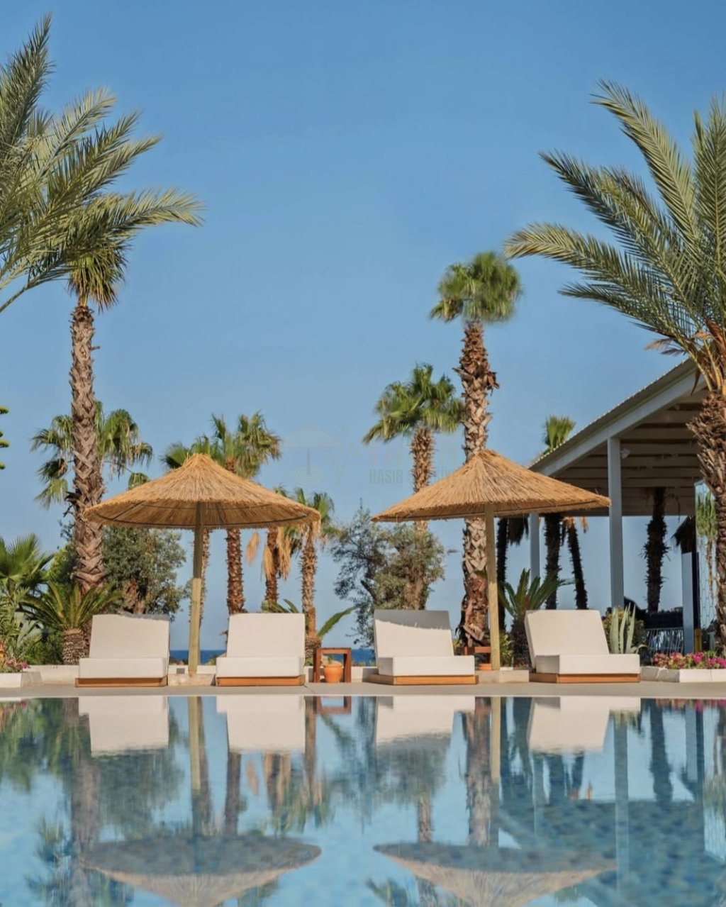 Ege sahillerinde hasır plaj şemsiyesi, dekoratif etkisiyle öne çıkar. Beyaz evlerin ve mavi denizin yanında doğal görünüm sunar. Özellikle beach club işletmeleri için prestij unsurudur.